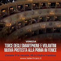 Anche venerdì, serata inaugurale della nuova stagione sinfonica della Fenice di Venezia, sono andate in scena proteste da parte degli spettatori di palchi e platea. Prima dell’inizio del ‘Canto del destino’ di Brahms, gli spettatori hanno acceso le torce dei loro telefonini. Alla fine dell’esibizione di orchestra e coro, diretti da Ivor Bolton, nuova pioggia di volantini dai palchi.