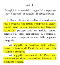 Si legge infatti che il reddito di cittadinanza è «l’insieme delle misure volte al sostegno del reddito per tutti i soggetti residenti nel territorio nazionale che hanno un reddito inferiore alla soglia di rischio di povertà ». Più oltre viene precisato che hanno diritto al reddito di cittadinanza tutti i soggetti che hanno compiuto il diciottesimo anno di età , che risiedono nel territorio nazionale e che hanno la cittadinanza italiana oppure provengono da paesi UE oppure da paesi che hanno «sottoscritto convenzioni bilaterali di sicurezza sociale» (qui la lista sul sito dell’Inps).