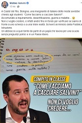«A Castel del Rio, Bologna, — scrive il Capitano su Facebook — una insegnante di italiano delle medie avrebbe chiesto agli studenti: “Come facciamo a cacciare Salvini?”».