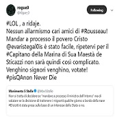 «#LOL , a ridaje. Nessun allarmismo cari amici di #Rousseau! Mandar a processo il povero Cristo @evaristegal0is è stato facile, ripetervi per il #Capitano della Marina di Sua Maestà de Sticazzi non sarà quindi così complicato. Venghino signori venghino, votate! #pisQAnon Never Die», scrive Rogue0 riprendendo il post del M5S in cui si mentiva, sostenendo che la decisione della Giunta per le autorizzazioni a procedere non decide su Salvini ma sulla responsabilità del governo (è vero il contrario).