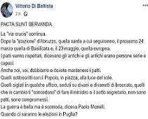 Mentre Alessandro Di Battista non dà segni di vita da ormai sedici giorni, il padre Vittorio su Facebook va all’attacco di Luigi Di Maio per la Via Crucis di sconfitte a cui ha costretto il M5S, di cui la Sardegna è l’ultima tappa: