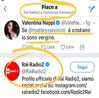 Scrive Salvini: “Caspita, contro di me addirittura la contessa Valentina Nappi (celebre artista del porno) con il Like di Rai Radio 2, pagata da tutti gli Italiani”