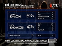 Il sondaggio di Tecnè mostrato ieri da Quarta Repubblica mostra che nella corsa alla poltrona di governatore dell’Emilia Romagna Stefano Bonaccini è in vantaggio su Lucia Borgonzoni di tre punti percentuali: 50,5% contro 47,5%.