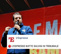 «Matteo Salvini è stato sconfitto dall’Espresso e sbugiardato dai giudici sullo scandalo dei 49 milioni confiscati alla Lega ma in gran parte spariti»: con queste parole L’Espresso annuncia la sentenza a suo favore .
