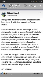 “Ci vuole coraggio a fare una richiesta così — aggiunge Frugoli -. Se gli verrà dedicato un ponte chiederò di dedicare una via alle stragi partigiane, o alle vittime dei partigiani e delle brigate rosse. No Pertini”.