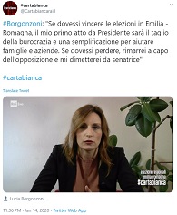 Il fatto è che la Borgonzoni ha letteratamente promesso che qualora avesse perso le elezioni si sarebbe dimessa da senatrice per continuare a fare il capo dell’opposizione in Consiglio Regionale.
