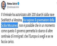 contro lo sbarco della nave Sea Watch a Messina perchè evidentemente il governatore della Sicilia non ha ancora capito che tenere gente su una nave non è una misura di quarantena ma un reato che si chiama sequestro di persona.