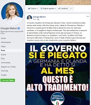 La pagina di Giorgia Meloni, ad esempio, ieri sera già delirava sul ministro Gualtieri che “ha firmato per attivare il MES, niente Eurobond e Italia messa sotto tutela. Alla fine hanno vinto i diktat di Germania e Olanda, il Governo in questi giorni ha fatto finta di alzare la voce ma, tanto per cambiare, si è piegato ai dogmi nordeuropei”.
