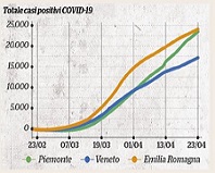 Negli ultimi 10 giorni i nuovi contagi in Emilia-Romagna sono stati 2682 (+11%), in Veneto 2306 (+14%) e in Piemonte 5049 con un aumento del 22% (dati del 22 aprile).