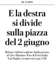 palco»: questa, racconta oggi Carmelo Lopapa su Repubblica è la proposta lanciata da Giorgia Meloni e Ignazio La Russa nelle due riunioni avute con Antonio Tajani e Matteo Salvini questa settimana a Palazzo Madama sulla manifestazione del 2 giugno convocata dal centrodestra.