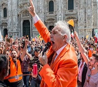 Pappalardo al microfono, all’interno di uno spazio di sicurezza creato da alcune persone che facevano da security, e centinaia di persone accalcate oltre le transenne provvisorie. Nessun distanziamento come impongono le norme anti coronavirus, tantissime mascherine abbassate o del tutto mancanti (e in Lombardia, tra l’altro, la mascherina è obbligatoria).