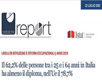 Gli italiani sono fra gli ultimi in Europa per livello di istruzione: il 62,2% delle persone tra i 25 e i 64 anni in Italia ha almeno il diploma, nell’Ue il 78,7% (nell’Ue a 28) dato che in alcuni tra i più grandi paesi dell’Unione sale ancora: 86,6% in Germania, 80,4% in Francia e 81,1% nel Regno Unito.