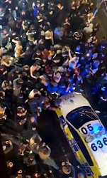 Centinaia di giovani ammassati in strada a ballare e saltare, tutti insieme e accalcati, senza