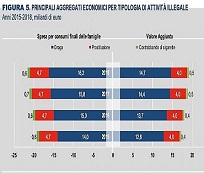Voce in crescita, invece, quella dell’illegalità che pesa per l’1,1% del Pil. “Rispetto al 2017, si è registrato un incremento dell’1,8%, pari a 342 milioni di euro, meno rilevante di quello dei due anni precedenti, quando l’economia illegale era aumentata di oltre 800 milioni l’anno. I consumi finali di beni e servizi illegali sono risultati pari a 21,6 miliardi di euro (corrispondenti al 2,0% del valore complessivo della spesa per consumi finali), in aumento di 0,4 miliardi rispetto al 2017”. A trainare questa crescita sono “per la quasi totalità ” gli stupefacenti: “Per questa attività il valore aggiunto sale a 14,7 miliardi di euro nel 2018 (+0,3 miliardi rispetto al 2017), e la spesa per consumi si attesta a 16,2 miliardi di euro (+0,4 miliardi rispetto all’anno precedente). Nell’ultimo quadriennio per il traffico di stupefacenti si è registrato un incremento medio annuo del 3,5% per il valore aggiunto e del 3,7% per i consumi, sostenuti soprattutto dalla dinamica dei prezzi”. La prostituzione registra valori stabili sia per i consumi finali che per il valore aggiunto (4,7 e 4,0 miliardi di euro rispettivamente), con una crescita media annua dello 0,5% dal 2015. L’attività di contrabbando di sigarette nel 2018 rappresenta una quota del 2,5% del valore aggiunto (0,5 miliardi di euro) e del 2,9% dei consumi delle famiglie (0,6 miliardi di euro) del complesso delle attività illegali.