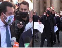 Il leader della Lega ruba la scena: collegamenti con le tv, capannello di giornalisti, i soliti disturbatori che impallano le telecamere. “Non fate assembramenti” dicono alcuni addetti della sicurezza”. Ma pochi a questo punto danno retta. E c’è chi si è piazzato accanto a Salvini per ascoltare cosa dice. Ed è senza mascherina. All’invito di indossarla, risponde: “Ancora con questa storia del covid? È tutto un complotto”.