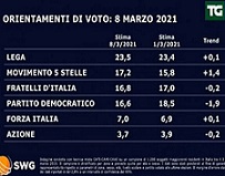 Al primo posto c’è ancora la Lega, senza particolari variazioni rispetto alla scorsa settimana, poco sopra al 23 per cento.