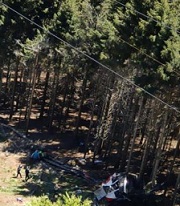 Nelle immagini a bassa definizione si vede anche l’ultima corsa verso l’alto interrotta a pochi metri dalla vetta quando si è spezzato il cavo trainante e la cabinovia ha ‘scarrellato’ verso il basso a velocità crescente dato che il sistema frenante di sicurezza non è entrato in funzione impedendo alla cabina di restare ancorata ai due cavi portanti.