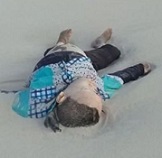 I piccoli sembrano avere più o meno un anno di vita. Uno indossa una tutina, e la sabbia lo ricopre in parte, come se fosse una copertina; uno è senza le scarpine. Insieme a loro un altro corpo, coperto di stracci, forse quello di una donna.