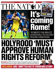 Stamattina il quotidiano scozzese e filo-indipendentista The National ha pubblicato una foto a mezza pagina dei giocatori azzurri che abbracciano l’eroe di giornata, Gianluigi Donnarumma, accompagnata dal seguente titolo: “It’s Coming Rome”.
