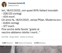 «Fine anche della favola “grazie al vaccino abbiamo ridotto i morti…”» scrive in un tweet l’eurodeputata Francesca Donato, pubblicando un confronto tra i contagi e i morti del 18 gennaio 2021 e quelli più recenti del 2022.