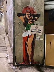 Un concetto sintetizzato perfettamente dallo street artist palermitano Tvboy, pseudonimo di Salvatore Benintende, che nel quartiere Cinque Vie a Milano ha raffigurato Silvio Berlusconi in versione femminile, con un cartello “Silvia for President”.