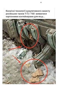 La lettera è stata pubblicata, integralmente, nel sito istituzionale dell’Agenzia nazionale (NAPC). All’interno vengono riportate alcune foto, come prova dell’impatto subito dalle forze russe a seguito del presunto furto del Ministro Sergei Shoigu. In una di queste (a pagina 4) mostrerebbe alcune protezioni di un carro russo realizzate con il cartone delle uova, come quelle che compriamo comunemente al supermercato