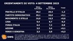 FdI, il partito della premier, scende sotto il 30% e tocca i 28,2% (-1,2% rispetto a un mese fa), come emerge dal sondaggio di Swg realizzato per il Tg La7 su un campione di 1.200 maggiorenni tra il 30 agosto e il 4 settembre 2023.