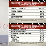 Uno scenario che vedrebbe dunque una possibile vittoria, sebbene “di corto muso”, della coalizione di centro-sinistra rispetto a quella di centro-destra. Con una ovvia postilla: che quegli attuali indecisi non decidessero alla fine di disertare le urne pure loro.