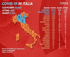 Superati i 20mila malati di coronavirus in Italia: sono complessivamente 20.603, con un incremento rispetto a sabato di 2.853, mentre il numero complessivo dei contagiati – comprese le vittime e i guariti – ha raggiunto i 27.747. Il dato è stato fornito dal commissario per l’emergenza Angelo Borrelli in conferenza stampa alla Protezione Civile.