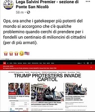«Sembrava filasse tutto liscio come l’olio e si aspettasse solo la formalità dell’insediamento del “presidente eletto dai media” e venivano liquidate le migliaia di segnalazioni di brogli elettorali come “pazzie” di Trump. Salvo ora accorgersi che invece centinaia di migliaia di americani si sentono defraudati», scrivono in un post successivo gli amministratori della pagina Lega Salvini Premier — Sezione Ponte San Nicolò (in provincia di Padova). E poi proseguono dicendo che loro, attraverso i social, avevano parlato delle tensioni statunitensi
