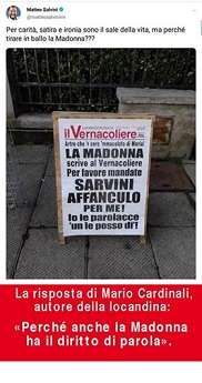 Il popolare mensile di satira livornese ha pubblicato un titolo che sfotte la passione di Salvini per usare la mamma di Gesù a fini politici: «Altro che cuore immacolato di Maria! La Madonna scrive al Vernacoliere: “per favore mandate Sarvini affanculo per me. Io le parolacce non le posso dire!». Satira appunto.