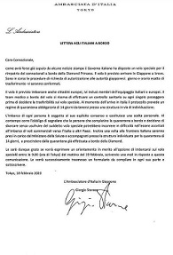 LA LETTERA DELL’AMBASCIATORE ITALIANO IN GIAPPONE AI CONNAZIONALI SULLA NAVE