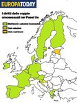 Attualmente 16 dei 27 Paesi Ue riconoscono e celebrano legalmente i matrimoni tra persone dello stesso sesso. Si tratta di Austria, Belgio, Danimarca, Estonia, Finlandia, Francia, Germania, Grecia, Irlanda, Lussemburgo, Malta, Paesi Bassi, Portogallo, Slovenia, Spagna e Svezia. In tutti questi Paesi, a eccezione dell’Estonia, sono consentite anche le adozioni per le coppie omosessuali (previste anche in Croazia).