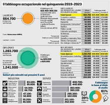 La somma del turnover e dei nuovi posti di lavoro creati dalla crescita economica porta a un fabbisogno totale di occupati di 2.725.500 persone in uno scenario più pessimistico, basato sulle previsioni formulate a gennaio 2019 dal Fondo Monetario di una crescita dello 0,6%. E sono 3.029.800 nel secondo scenario, basato sulle previsioni più ottimistiche formulate a dicembre 2018 dalla legge di Bilancio.
