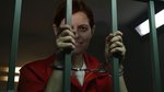 Un paio di manette legate ai polsi, le mani sulle sbarre, una tuta arancione da carcerata e