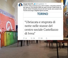 «Ennesima violenza all’interno di un centro sociale — ha scritto la Meloni -. La mia piena vicinanza alla ragazza e tolleranza per questi criminali. Fratelli d’Italia, da sempre, chiede l’immediata chiusura dei centri sociali, vere e proprie zone franche dove droga e illegalità regnano sovrane».