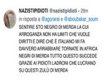 “Sentire sto neg*o di mer*a la cui arroganza non ha limiti che vuole diritti e dire che è italiano mi fa davvero arrabbiare tornate in Africa neg*i di mer*a tutto questo succede grazie ai pidioti ladroni che lucrano su questi zulù di mer*a”.