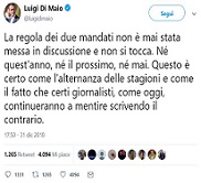 Fatto sta che nel pomeriggio Di Maio si sentì in dovere di intervenire: “La regola dei due mandati non è mai stata messa in discussione e non si tocca. Nè quest’anno, nè il prossimo, nè mai. Questo è certo come l’alternanza delle stagioni e come il fatto che certi giornalisti, come oggi, continueranno a mentire scrivendo il contrario”.