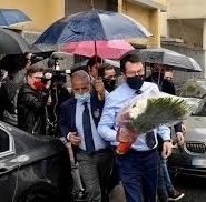 Il leader della Lega, dopo aver deposto i fiori, è risalito un macchina