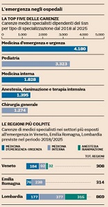 Con le tre Regioni finora più colpite per numero di contagi — Lombardia, Veneto ed Emilia Romagna — che da sole contano 1491 medici in meno rispetto a quanti ne servirebbero: 869 in Lombardia, 314 in Emilia e 308 in Veneto.