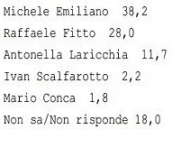 SONDAGGIO EUROMEDIA PUGLIA: EMILIANO 38,2%, FITTO 28%, LARICCHIA 11,7%, SCALFAROTTO 2,2%