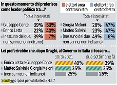 Alla domanda «chi preferirebbe al governo per il dopo Draghi?», posta dall’Istituto Ipsos di Nando Pagnoncelli per la trasmissione DiMartedì su La7,gli elettori rispondono con un sorprendente risultato: il 40% vorrebbe l’abbinata Conte-Letta, il 35% quella Salvini-Meloni
