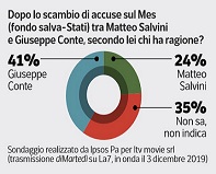 Anche se c’è una fetta importante di persone che non sanno e non indicano una preferenza visto che il tema è tecnico, la maggioranza degli italiani, ben oltre la somma dei voti dei due grandi partiti che attualmente la compongono, dice che ha ragione il presidente del Consiglio mentre nonostante la Lega sia accreditata tra il 31 e il 34% nei sondaggi soltanto il 24% degli interrogati dà ragione al Capitano.