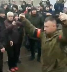 UN SOLDATO RUSSO, AGITANDO DUE GRANATE, SI FA LARGO IN MEZZO A UNA FOLLA DI UCRAINI E LANCIA UN ULTIMATUM: ARRENDERSI O COMBATTERE